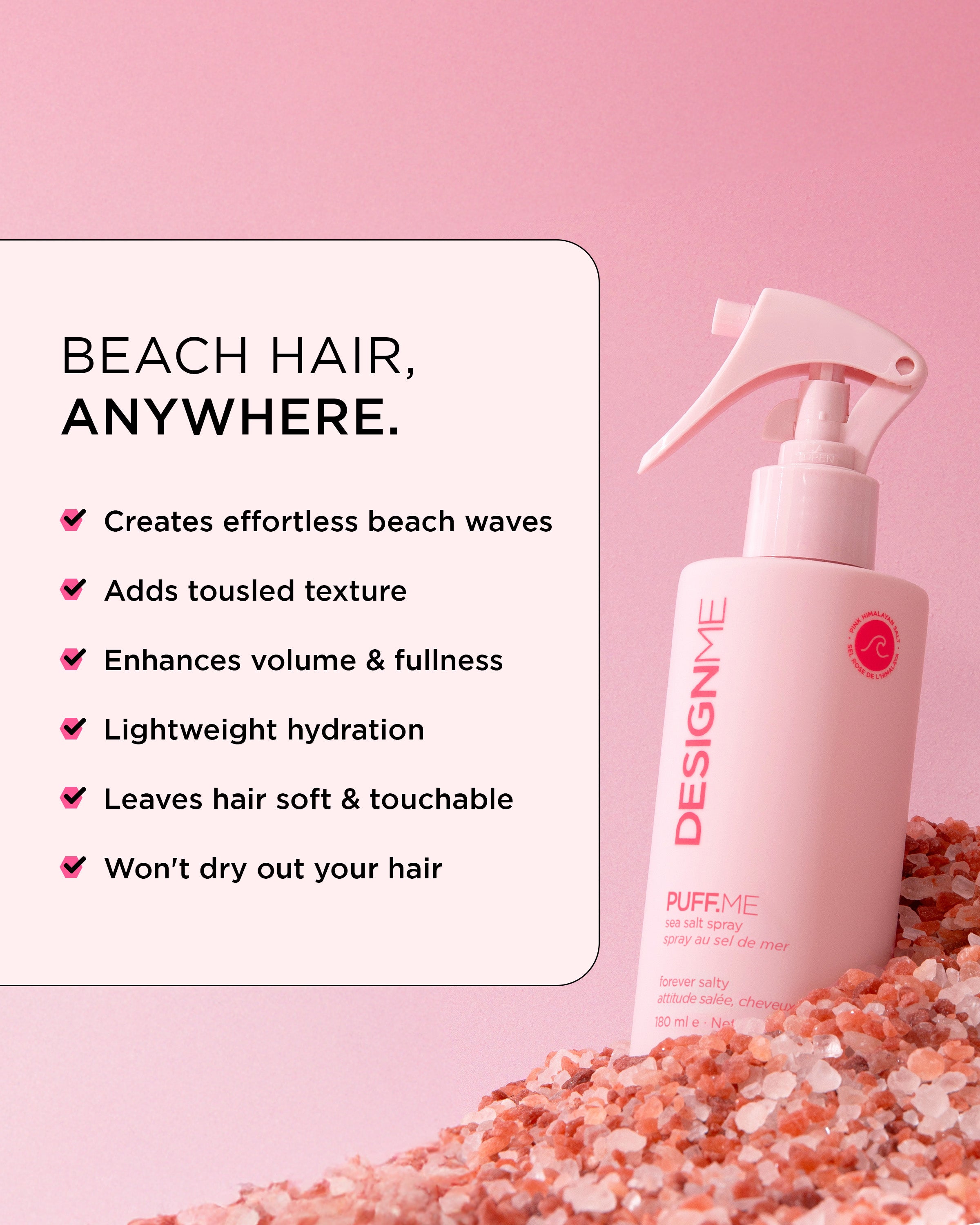 Wave hello to PUFF.ME sea salt spray, your new secret to effortless texture & endless beach waves, no ocean required. Infused with Pink Himalayan Salt, this beachy waves spray creates tousled fuller-looking hair with natural volume and soft, crunch-free hold. Plus, hydrating ingredients like aloe vera and panthenol keep strands soft, touchable and never dried out. Finally, a non drying sea salt spray that hydrates as it texturizes, for beach hair that feels as good as it looks.